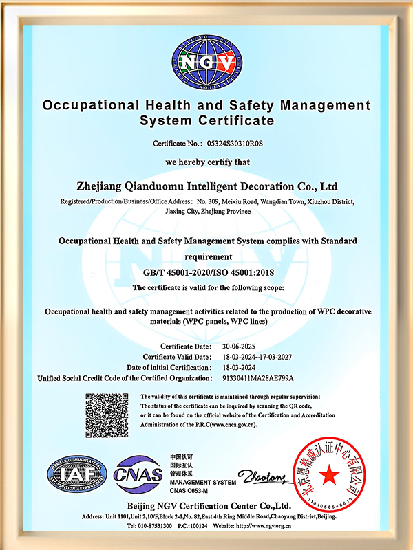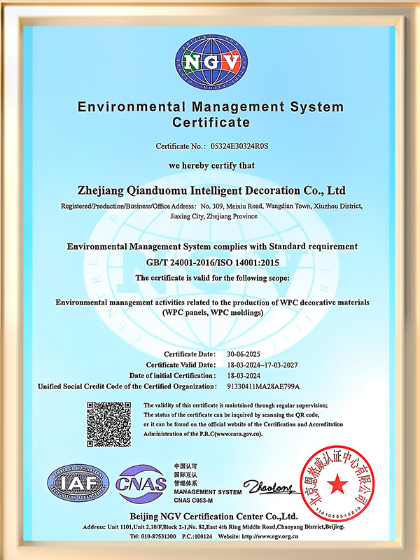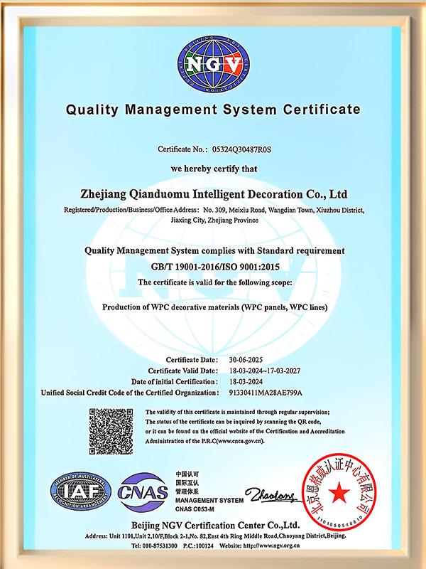 Zhejiang Qianduomu Intelligent Decoration Co., Ltd.is China Custom WPC Composite Cladding Manufacturers and WPC Wall Claddings Factory, established in 2009, is a professional enterprise specializing in the research, development, production, sale and service of wall panels, wall cladding, decorative lines and ceiling panels.